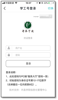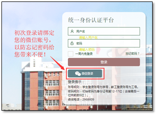 2、服务大厅PC端和移动端APP的登录用户名为学号/教工号,初始密码为身份证号的12-17位。PC端和APP都提供有密码修改功能,在任何一处进行了密码修改,则PC端和APP的密码都变更为修改后的新密码。温馨提醒:建议绑定个人微信号,以防忘记密码给您带来不便!
