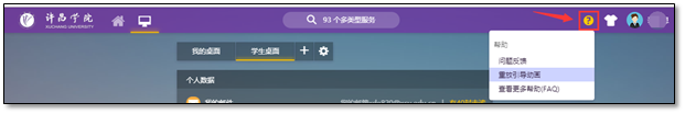 5、在线帮助与问题反馈。智慧校园服务大厅帮助向导位于服务大厅主页面的右上角(如图4所示),初次登录服务大厅的用户系统会自动播放服务大厅的“使用引导动画”,如您需要再次播放,可以点击此处的“重放引导动画”来重复观看。
