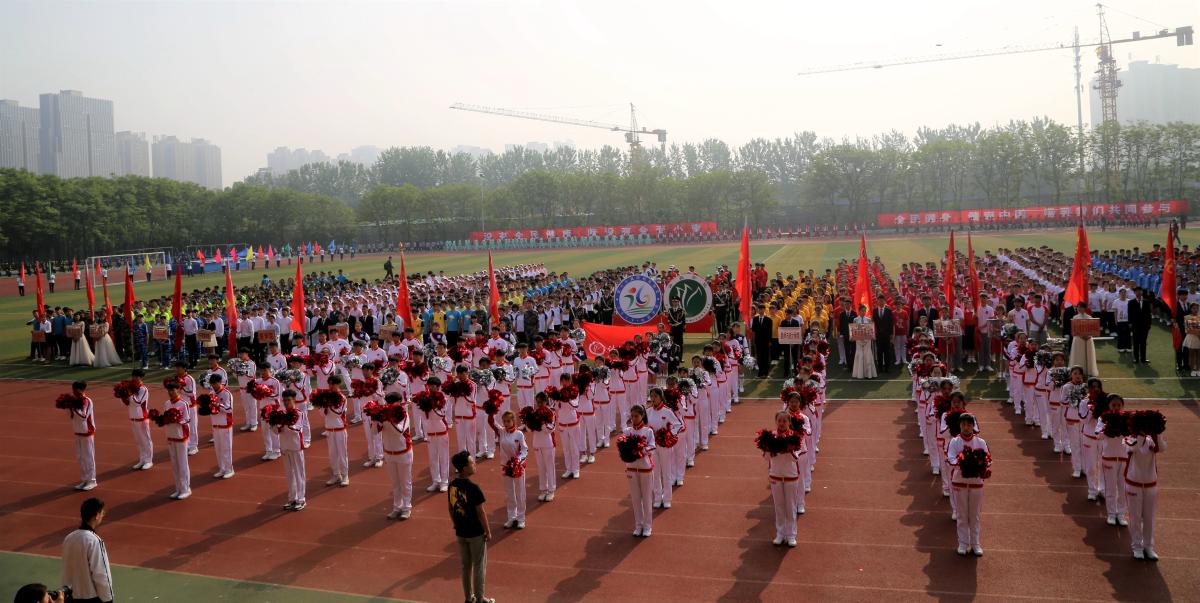 上午8时,伴随着雄壮激越的《运动员进行曲》,全体裁判员、运动员在校旗、第十六届田径运动会会徽和彩旗方队的引导下入场。