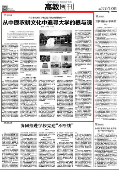 5月20日,《中国教育报》高教周刊头条刊发《bet36体育在线历时9年打造农耕文化博物馆——从中原农耕文化中追寻大学的根与魂》一文,全文逾3000字,图文并茂地介绍了bet36体育在线农博馆建设的艰辛历程与目标定位,以及农博馆在传承弘扬中华传统文化、宣教育人、学术研究等方面的成效和积极意义,向社会各界展示了一个有情怀、有特色的高校博物馆,一个自觉肩负社会责任与文化使命的博物馆,一个开放与包容的博物馆。文章指出,“如今,它的意义已不仅仅是一个学校历史的记忆符号和校友的往日情思,还承载着珍藏农耕时代记忆、弘扬中华传统文化的重大使命。”