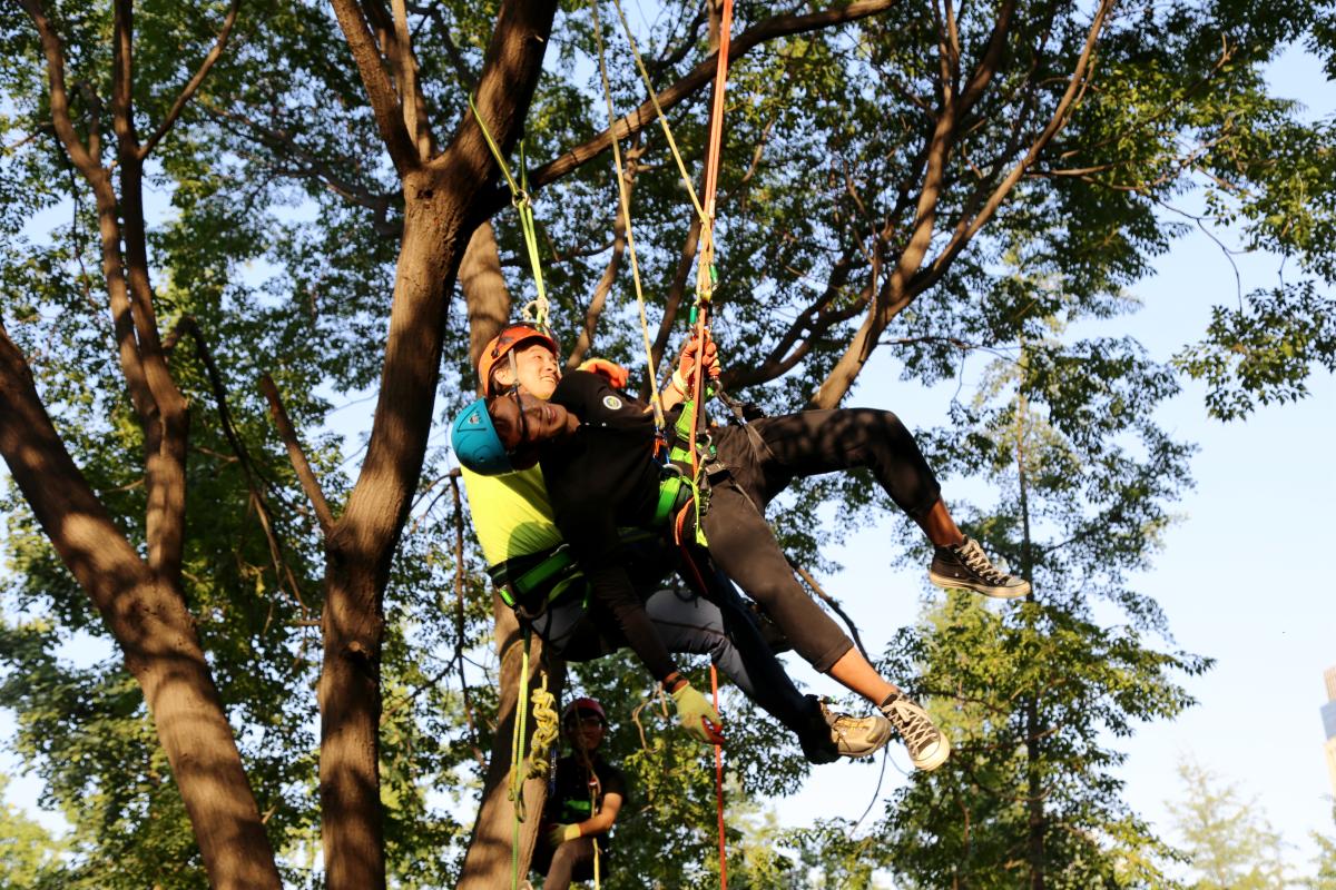 任课老师李学良告诉我们,一说起攀树,很多人都会联想到小时候爬树摘果子、掏鸟窝等等的故事。但其实,攀树与爬树完全是两码事,爬树只能依靠上下肢力量拉拽踩踏树干,不仅累而且没有安全措施,如果遇到较高的笔直树干就只能望而兴叹了。而攀树则是一项借助专业装备完成上升、下降、走枝、飞枝等动作的户外运动项目,除了能体验与平地不同的视觉感受,观察多样的自然生态外,还能修缮树木帮助树木成长。