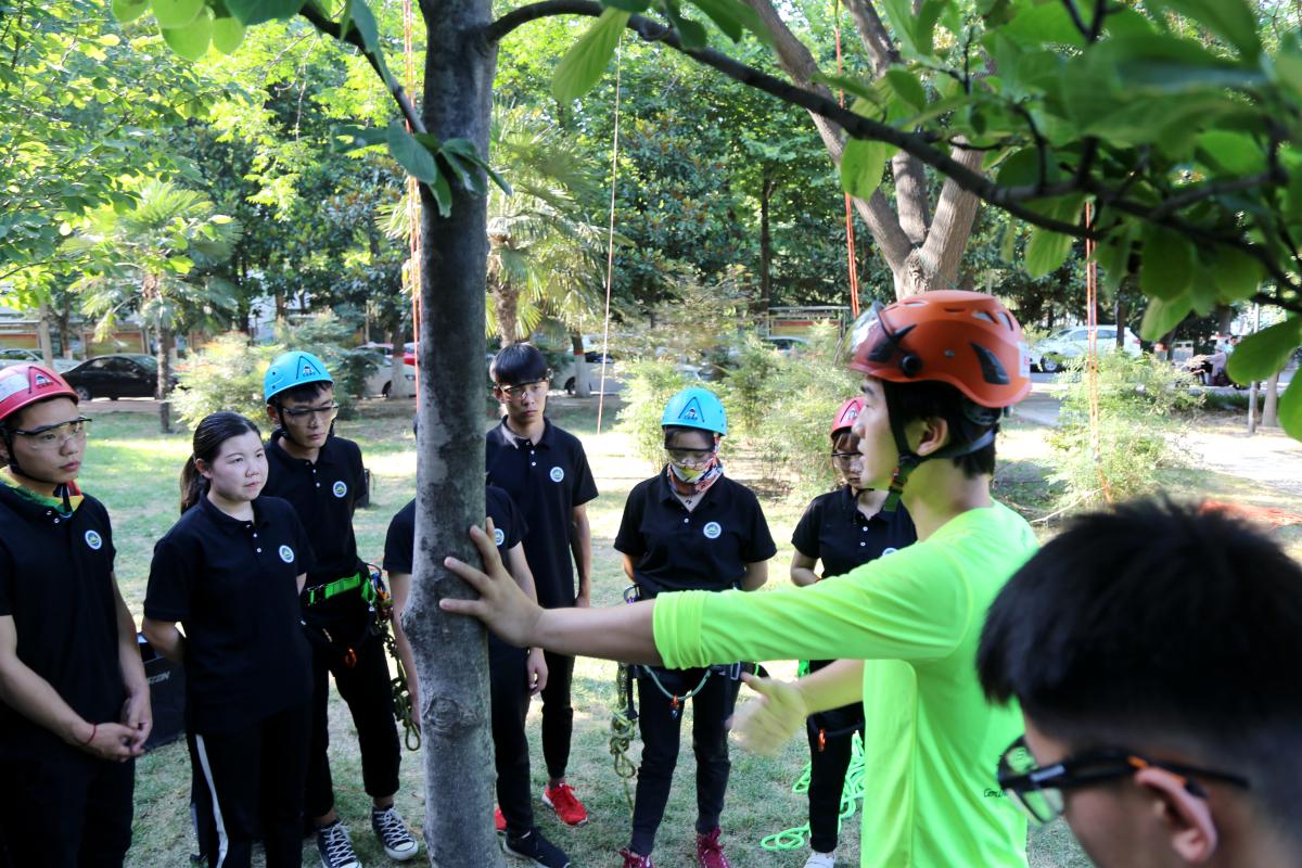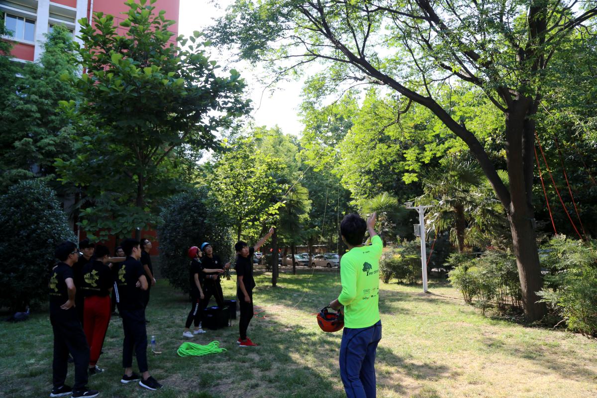 仲夏六月,烈日炎炎。在学校办公楼东侧的苦楝树清凉树荫下,经常会有一群正在上攀树课的师生引人驻足侧目。他们在这棵五层楼高的大树上挂了几根绳子,地上整齐的摆放着绳索、头盔、安全带、锁扣……没错,他们就是要爬到高高的树上——上课。