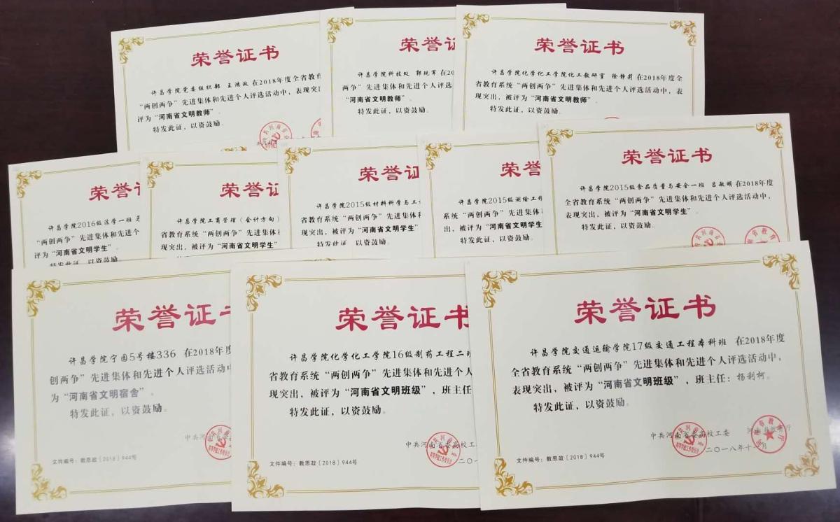 近日,bet36体育在线在省委高校工委、省教育厅开展的2018年度全省教育系统“两创两争”活动先进集体和先进个人的评选工作中喜获佳绩。bet36体育在线化学化工学院16级制药工程二班(班主任:谢智宇)、交通运输学院17级交通工程本科班(班主任:杨利柯)两个班级被评为“河南省文明班级”;宁园5号楼336被评为“河南省文明宿舍”;科技处郭现军、党委组织部王鸿政、化学化工学院徐静莉三名教师被评为“河南省文明教师”; 2015级材料科学与工程1班陈璐、2015级测绘工程1班贾朝阳、2015级工商管理(会计方向)1班刘雅婷、2015级食品质量与安全一班吕敏明、2016级法学一班马原五名同学被评为“河南省文明学生”。